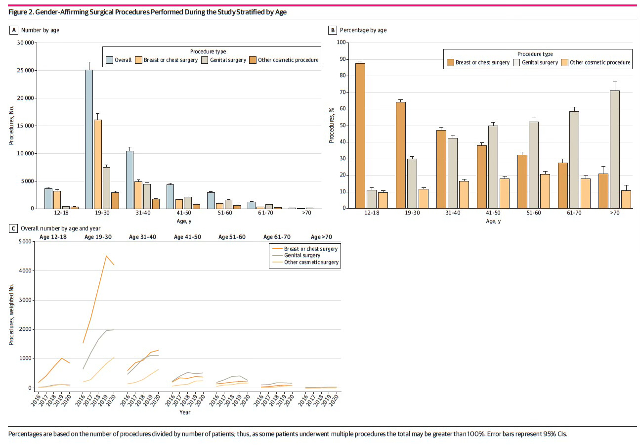 Let’s dispel the myth propagated by both the press release and the Them article that the “vast majority” of gender-affirming surgeries in minors are conducted on cisgender boys. (Note that the press release in question is dated July 8, and thus was published after the Them article. I haven’t been able to find a version of the release published prior to the article; perhaps the press-release copy that prompted the article went out only via email. It’s possible the Them article was written based on a somewhat different press release than what is currently on the Harvard web site; but the article makes clear it drew a quote from Dai from a press release.)