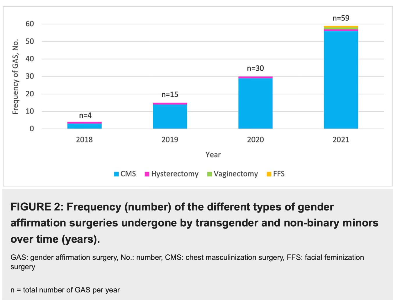 A study published in Sept. 2023 in the journal Cureus analyzed data from the American College of Surgeons National Surgical Quality Improvement Program Pediatric database, covering 2018 to 2021 and looking at Americans under age 18. The authors found a swift growth curve in the annual number of gender-affirming surgeries for trans minors. Almost all the procedures were chest masculinization surgeries (CMS). Keep in mind this study relied on an even more limited set of data than the Harvard group did, so the actual numbers are especially small.