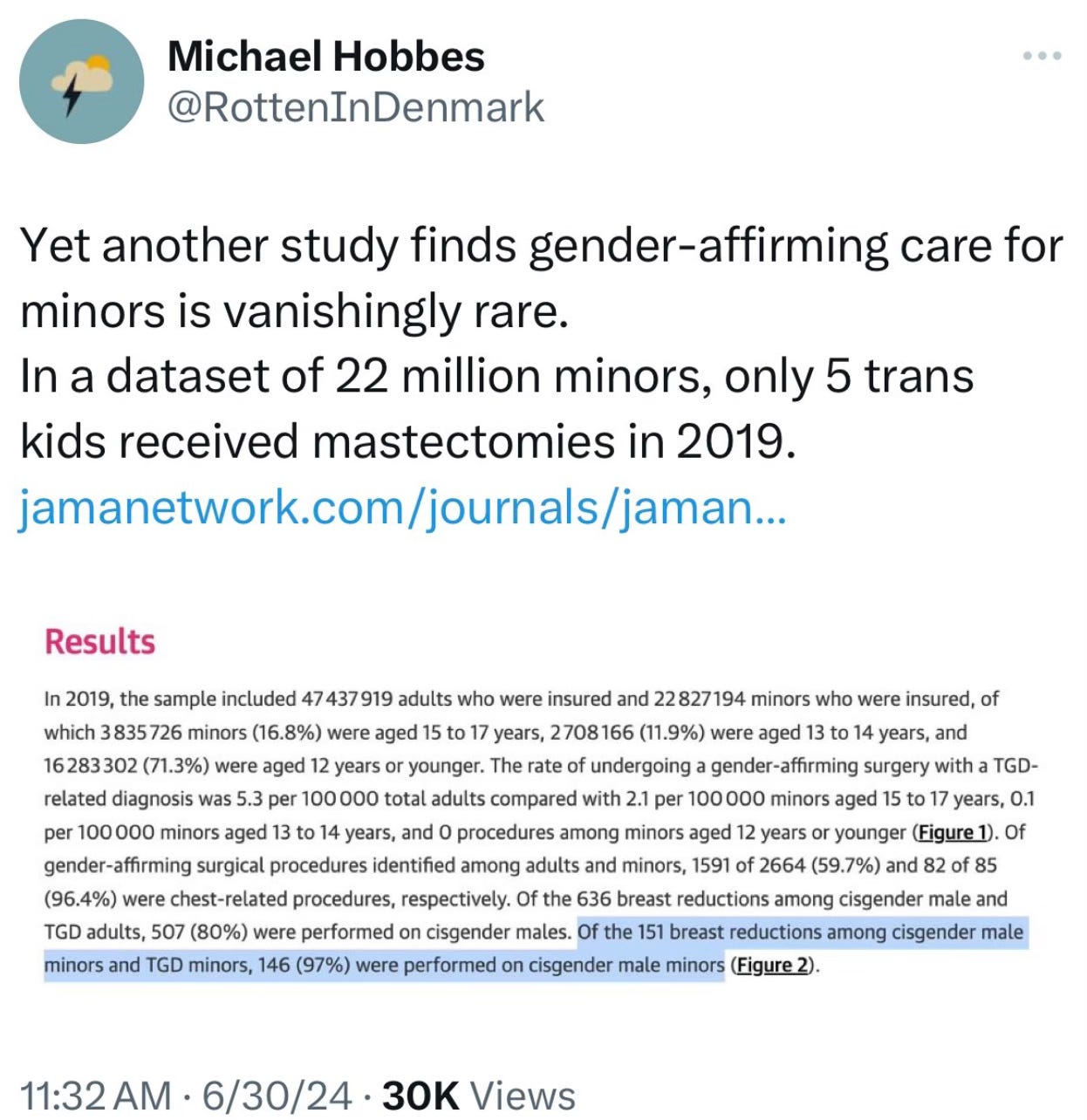 This begs the question of why the study authors made this comparison in the first place when they knew that it would leave out the vast majority of gender-affirming surgeries among trans minors. Plus, they might’ve imagined that their findings would be misinterpreted.