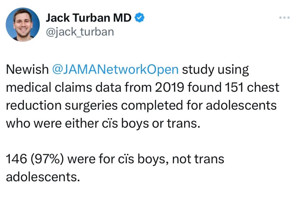 Dr. Jack Turban, a child psychiatrist at the University of California, San Francisco, who has made himself into the face of pediatric gender medicine, either overlooked or ignored the 82 chest-related gender-affirming surgeries in trans kids and zeroed in on the misleading claim about 97% of chest-reduction surgeries being in cisgender boys.