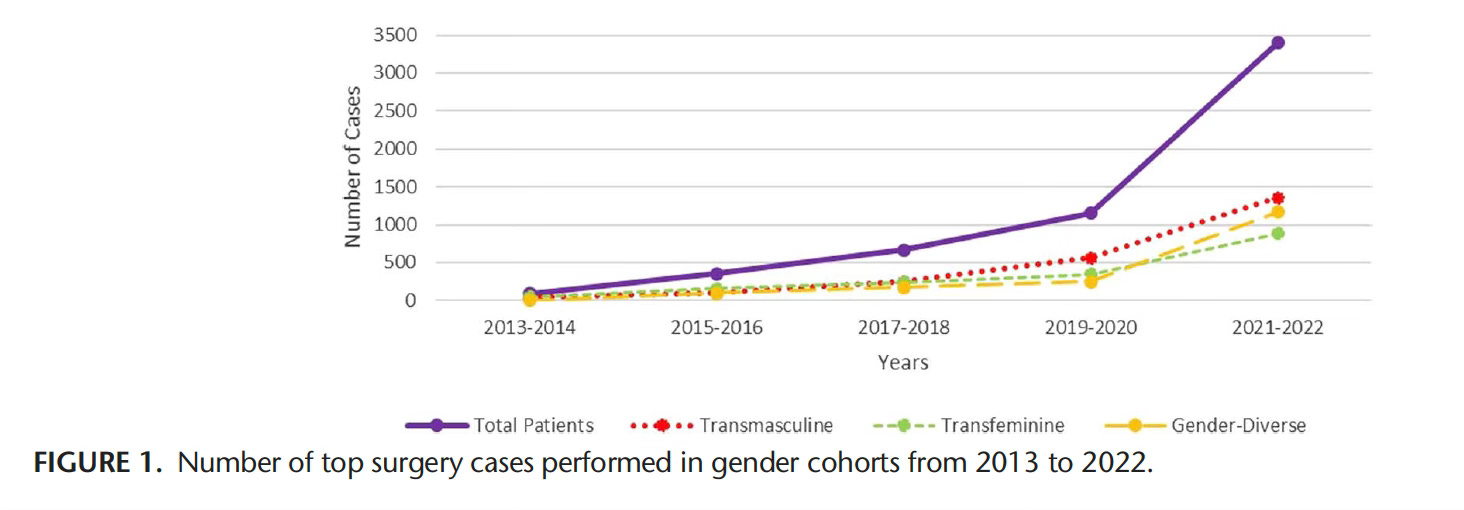 All that said, these charts demonstrate dramatic recent growth in gender-affirming surgeries among adolescents and young adults: