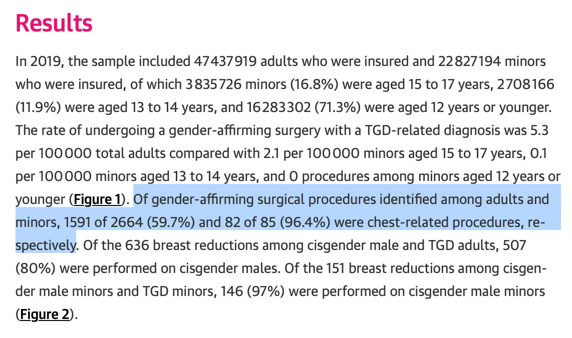 “Of the 636 breast reductions among cisgender male and TGD adults, 507 (80%) were performed on cisgender males. Of the 151 breast reductions among cisgender male minors and TGD minors, 146 (97%) were performed on cisgender male minors.”