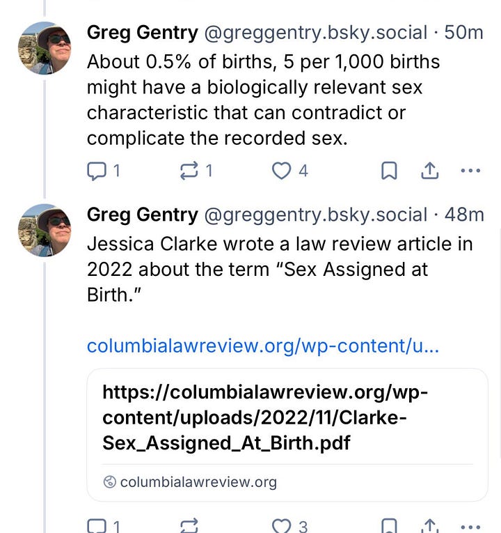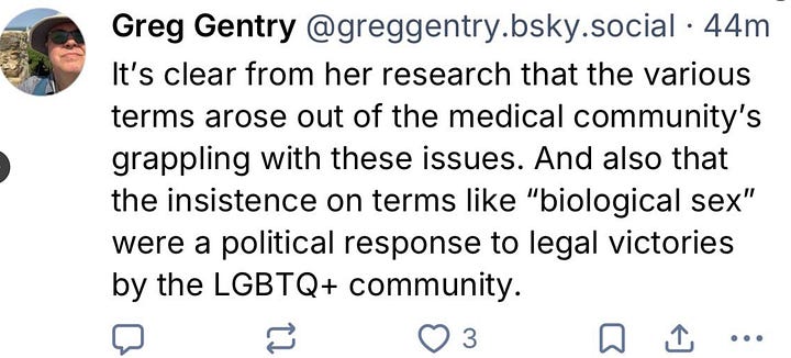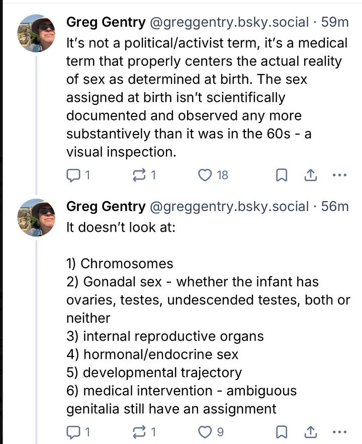 Some in the Bluesky universe have argued in response to my recent X thread about this subject that “biological sex” is verboten because the term was cooked up as an anti-trans dog whistle by conservatives in the mid-2010s. That may be so. But just as LGBTQ people have reclaimed the word “queer” whether many of us Gen X gays like it or not, so can well-meaning people use “biological sex” without the transphobia that flourishes in certain corners of the far right. If the term simply seems too tainted, then “natal sex” is a decent alternative; it seems to ruffle fewer feathers. The TJA, in fact, endorses doing so, calling that term less politicized than “biological sex.”