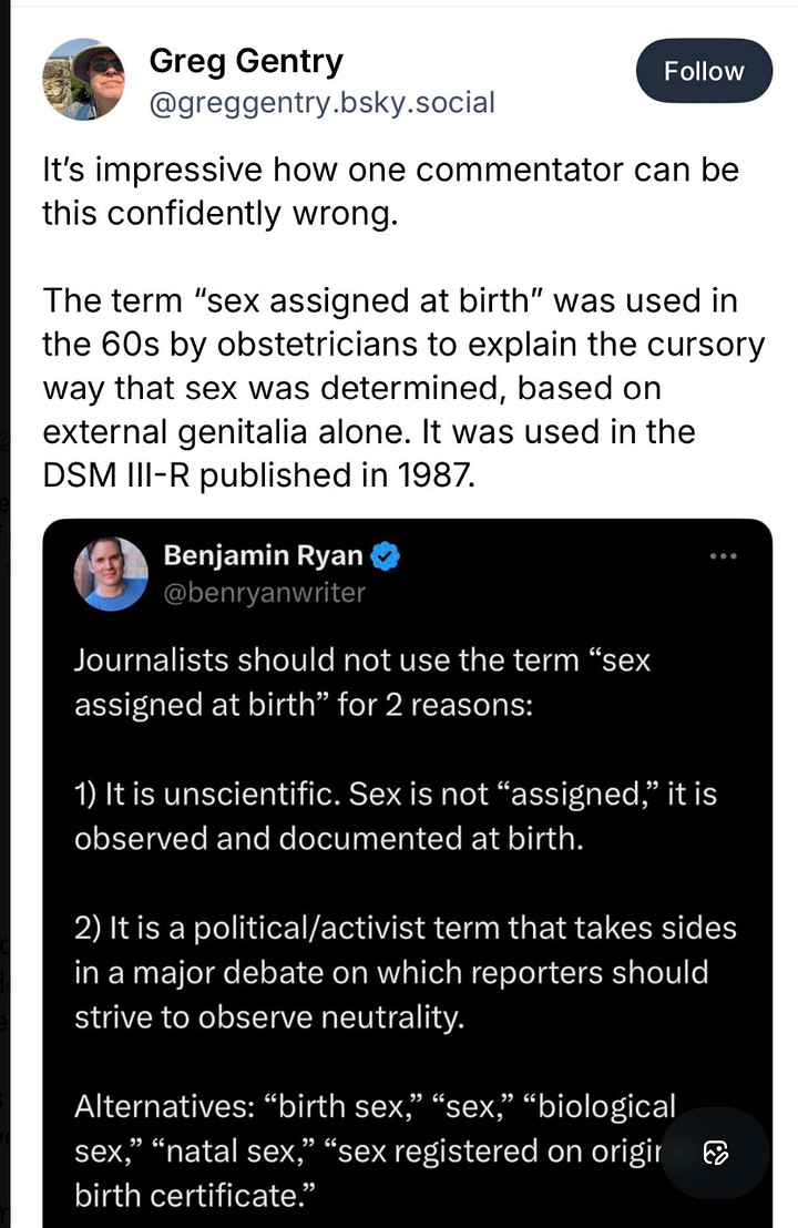 I am an admirer of your journalism and your unstinting attempts at neutrality in your coverage of trans issues - a tough gig in these divisive times. I commend you on this excellent critique of journalists’ adoption of ideologically loaded terms such as Assigned Male At Birth.