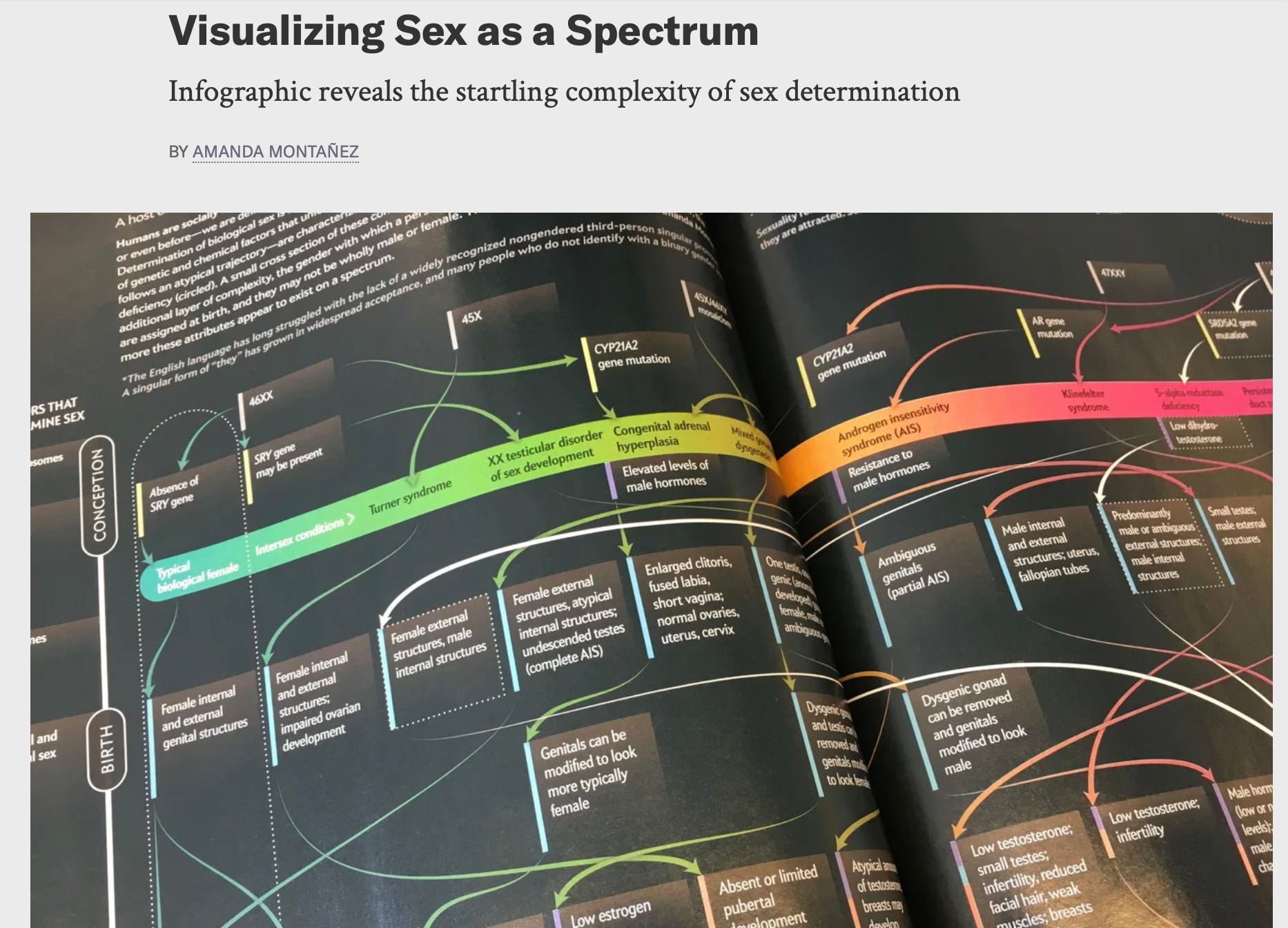 Firstly, the term “intersex” is increasingly regarded as misleading in clinical medicine, because it suggests the existence of a third sex rather than atypical development within a binary reproductive framework. Binary sex is defined by whether a person’s body is geared around producing either the small gamete (sperm) or the large gamete (ovum), regardless of whether a person is ever fertile. Many academics have convinced themselves in recent years that sex is, in fact, a spectrum. It is the journalist’s job to resist reporting as truth this activist-inflected distortion of one of the most obvious facets of human biology. Going off the rails on this subject is how Scientific American torpedoed its once sterling reputation and made a mockery of its claim to represent science. (SciAm has since distanced itself from its notorious “Sex as a Spectrum” infographic, adding an editor’s note: “This article was published in Scientific American’s former blog network and reflects the views of the author, not necessarily those of Scientific American.”)