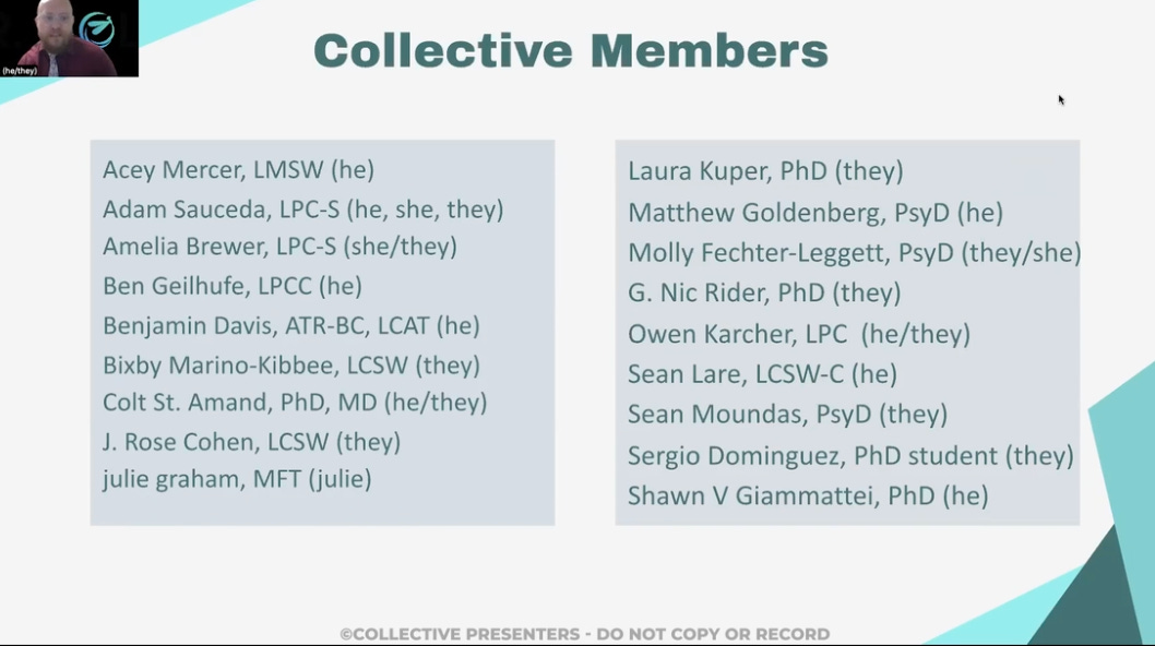 In this video, a team of six self-described “providers, clients, advocates and activists” presented an assessment model at the 2023 USPATH conference that a collective of them had spent two years developing. Dr. Colt St. Amand, a psychologist and family medicine doctor in New York state, introduced the session, cautioning attendees to keep a lid on it: “By viewing this presentation, you also agree not to record or photograph or transmit any portion of the presentation or the slide deck or conversations among the participants,” he said. Here are the collective members: