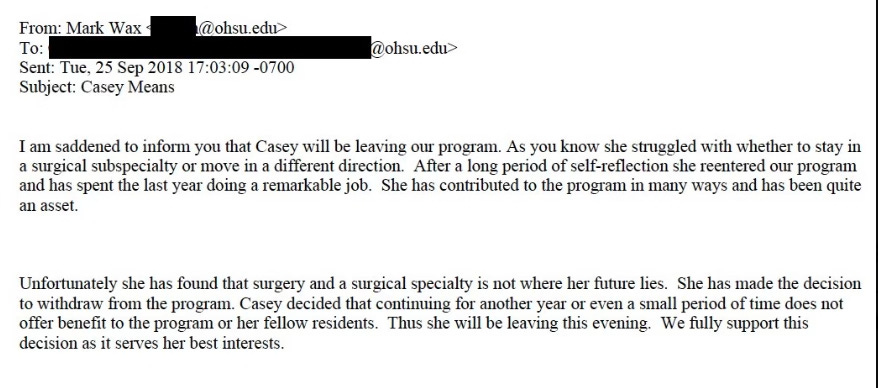 This is in keeping with what Dr. Means told her superiors at OHSU in 2018, according to the emails I obtained. These documents also indicate that Dr. Means, despite having recently taken a leave of absence from her residency to reflect on her future, remained in good standing with the program at the time of her departure in September 2018. She apparently scored well on a recent assessment. In all the documentation I obtained, her superiors spoke well of her. Their exchanges were quite good natured, sprinkled with exclamation marks and well wishes, as well as the requisite deference of a medical resident—or former resident—toward her busy former superior.