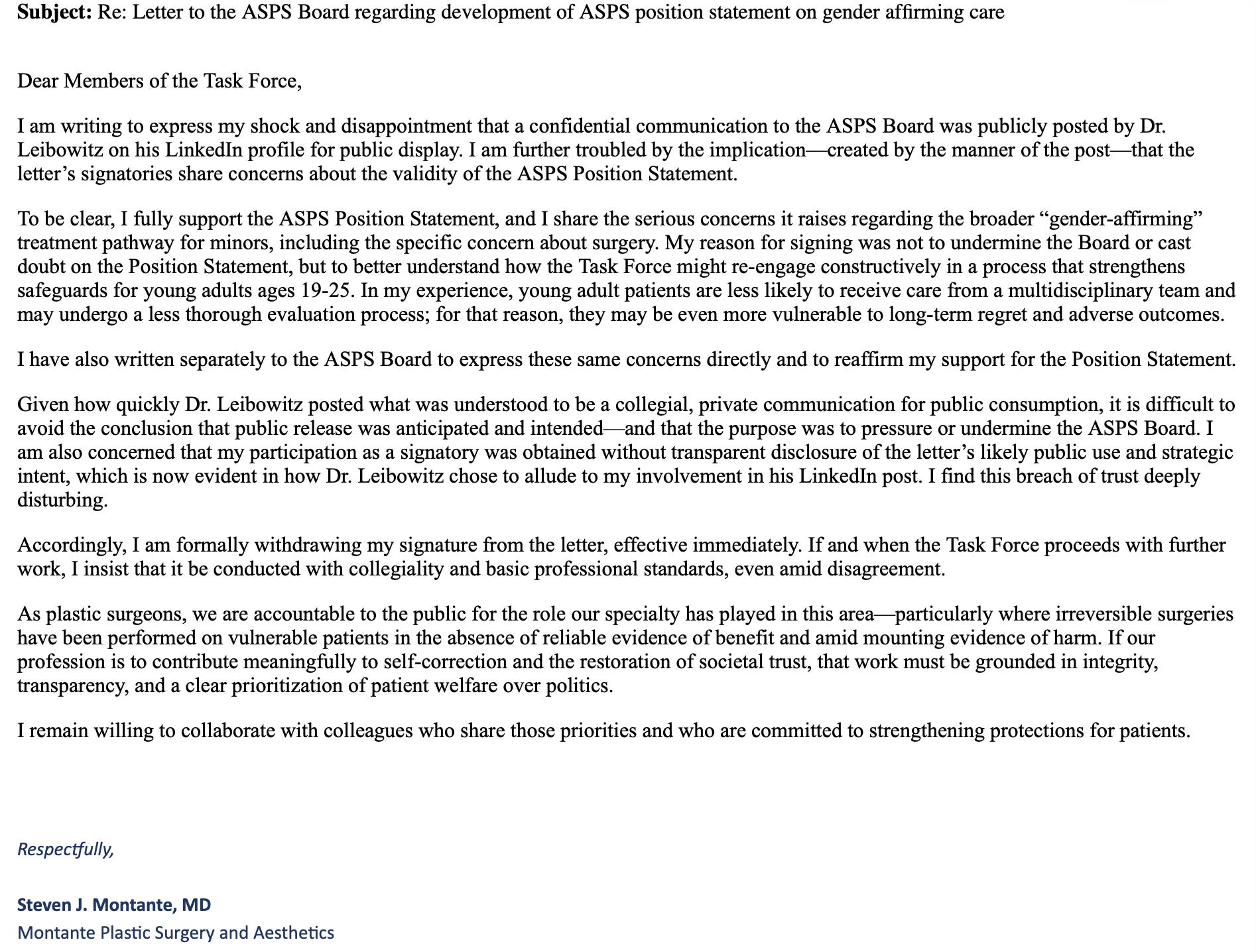 The public release of the letter, which sought clarification from the ASPS board regarding its development of the position statement, has led to further friction within the task force. Dr. Steven Montante, a Virginia plastic surgeon, signed the letter thinking it would remain private and has since sought to withdraw his signature. In his own letter he sent to the ASPS board on Thursday morning, which I obtained, he said he thought the organization should have actually set the minimum age for gender surgeries at 25 years old.