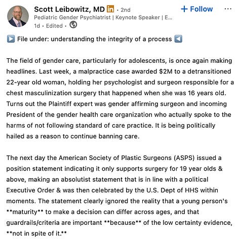 Criticizing the ASPS’s position statement’s choice of 19 as a minimum age, Dr. Leibowitz wrote in that LinkedIin post: “The statement clearly ignored the reality that a young person’s **maturity** to make a decision can differ across ages, and that guardrails/criteria are important **because** of the low certainty evidence, **not in spite of it.**”