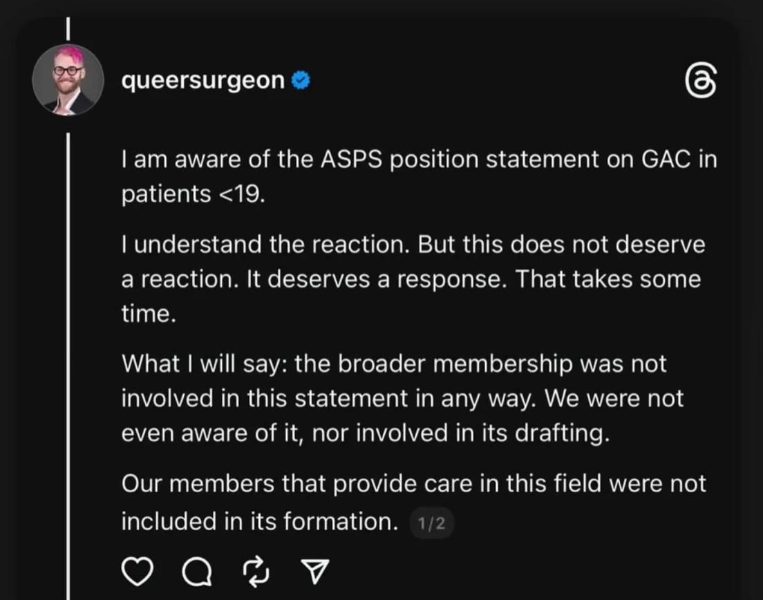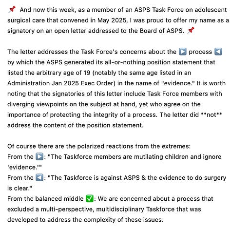 The letter addresses the Task Force's concerns about the ▶️ process ◀️ by which the ASPS generated its all-or-nothing position statement that listed the arbitrary age of 19 (notably the same age listed in an Administration Jan 2025 Exec Order) in the name of “evidence.” It is worth noting that the signatories of this letter include Task Force members with diverging viewpoints on the subject at hand, yet who agree on the importance of protecting the integrity of a process. The letter did **not** address the content of the position statement.