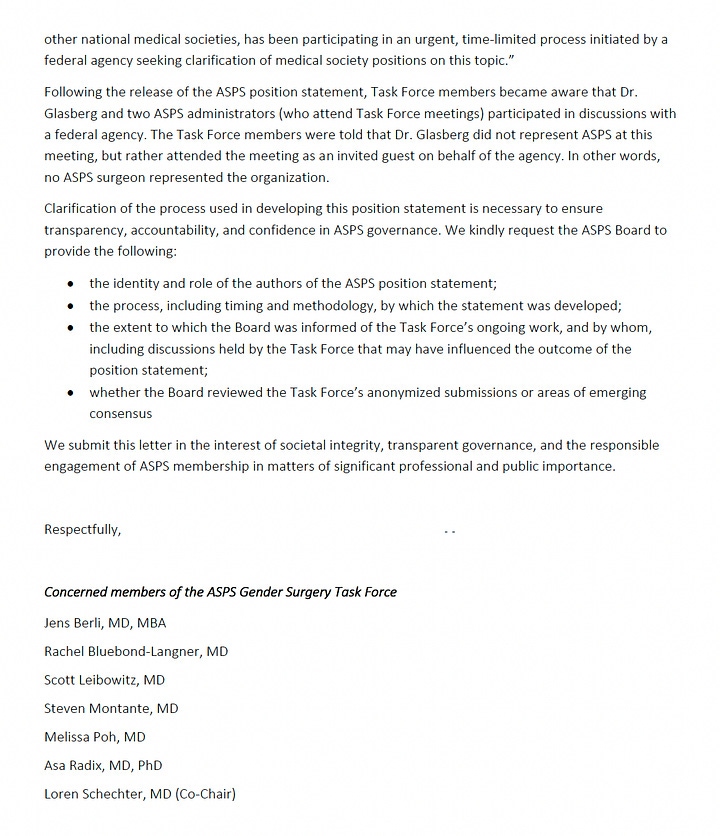 According to a two-page open letter that was signed by seven members of this youth gender surgery task force and sent to the ASPS board on Monday, the board cut the task force out of the loop when it came to developing and releasing the new position statement on youth gender surgeries.