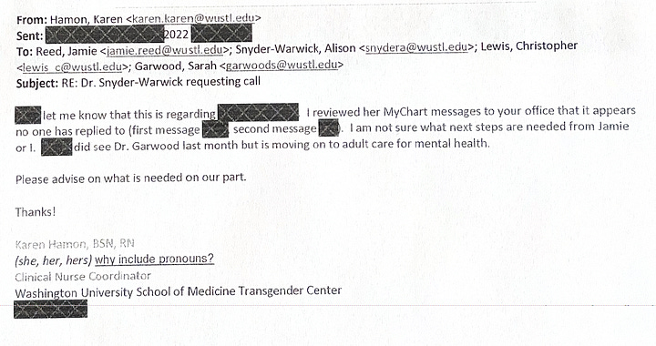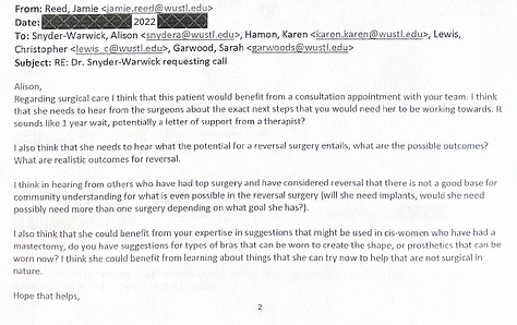 Another signatory is Dr. Alison Snyder-Warwick, the chief of plastic surgery at the University of Michigan. In 2022, she was a plastic surgeon at Washington University at St. Louis. According to an email exchange the Sun obtained from Jamie Reed, a former case manager in — and whistleblower from— the university’s since-shuttered pediatric gender clinic, Dr. Snyder-Warwick responded with apparent reluctance to emailed inquiries about a young patient who had detransitioned and was seeking reconstruction following the mastectomy the university hospital performed.