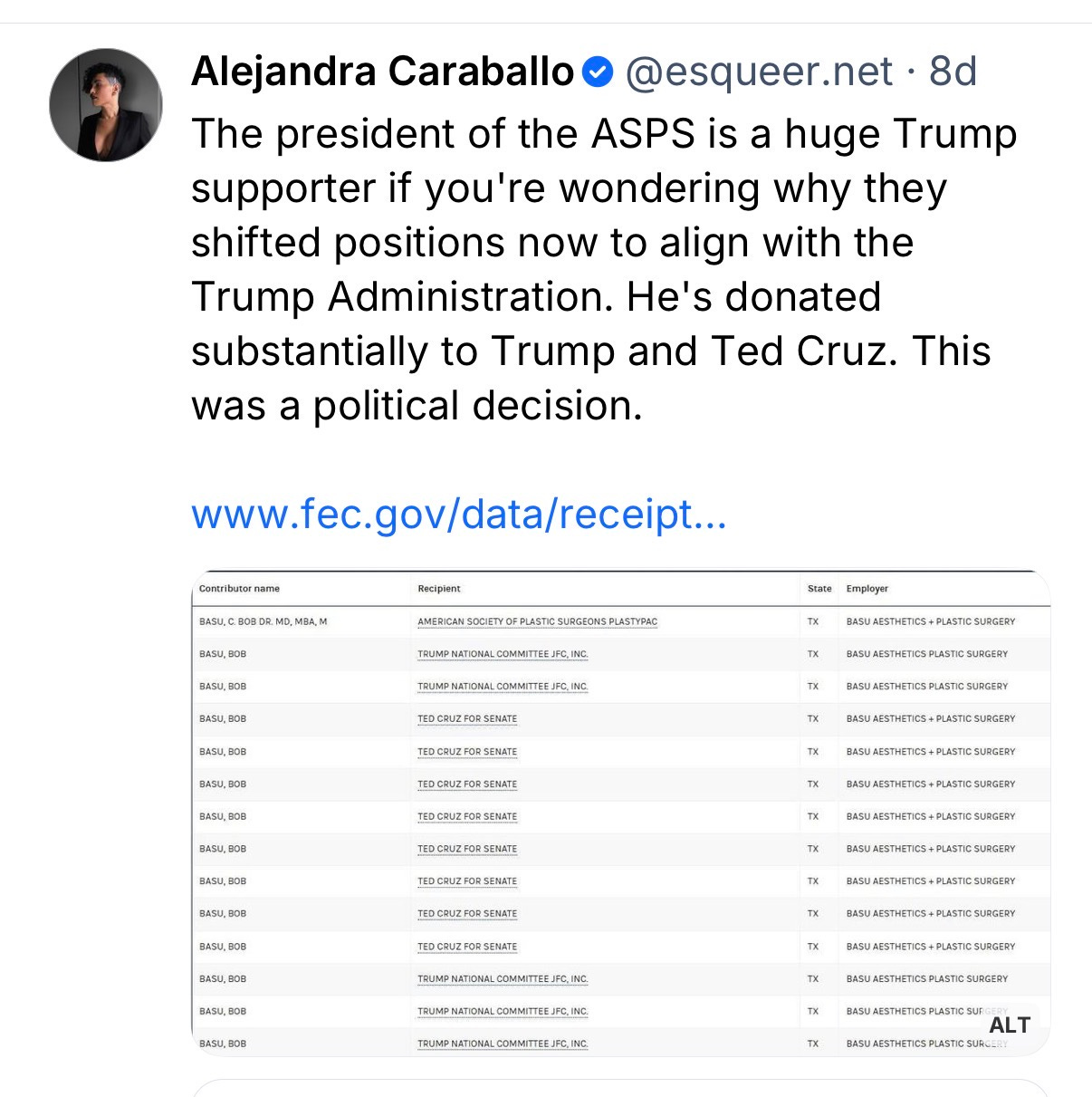 Alejandra Caraballo, a clinical instructor at Harvard Law School and transgender activist, on Feb. 4, posted to Bluesky records indicating that the ASPS president, Dr. Bob Basu, is, in her words, “a huge Trump supporter,” given his many political donations to the president and to related super PACs.