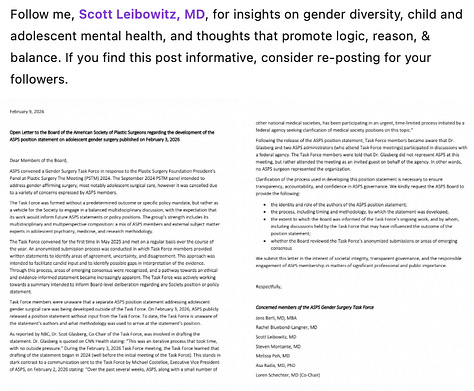 As Dr. Leibowitz emphasized on LinkedIn, the letter did not, however, contain complaints or comments about the actual contents of the ASPS position statement on youth gender surgeries. When I spoke with Dr. Leibowitz, he was keen to emphasize that the letter “addresses process-related issues,” with respect to how the position statement was developed and released. “The members of this task force had no knowledge of some long-standing process” on the part of the board to develop the position statement, said Dr. Leibowitz. He emphasized that he was speaking as an individual task force member and not in his capacity as a leader at WPATH.