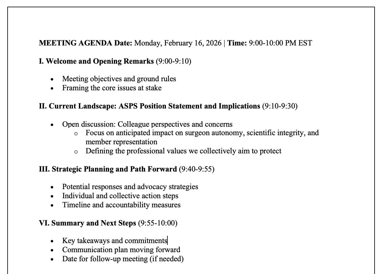 ASPS members who have a history of performing gender surgeries on adolescents are slated to meet on Monday evening to discuss strategy and next steps in the wake of the release of the board’s policy on such interventions. This is according to the agenda for their meeting, which I obtained, along with a copy of the broadcast email, which bears the subject line: “Collective Action Plan: ASPS Statement 2-16-26 9pm EST,” and was sent to over 100 doctors on Wednesday afternoon. One agenda item—“Focus on anticipated impact on surgeon autonomy, scientific integrity, and member representation”—apparently suggests that these physicians are now grappling with how to process the particulars of the new ASPS policy on youth gender surgeries.