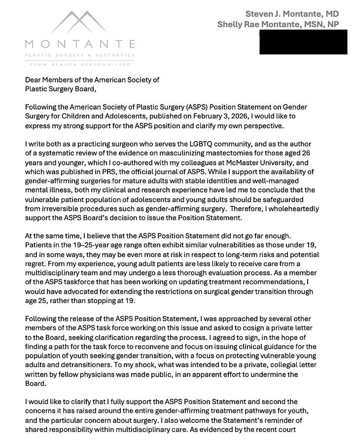 Dr. Montante separately wrote the board on Thursday morning: “While I support the availability of gender-affirming surgeries for mature adults with stable identities and well-managed mental illness, both my clinical and research experience have led me to conclude that the vulnerable patient population of adolescents and young adults should be safeguarded from irreversible procedures such as gender-affirming surgery.”