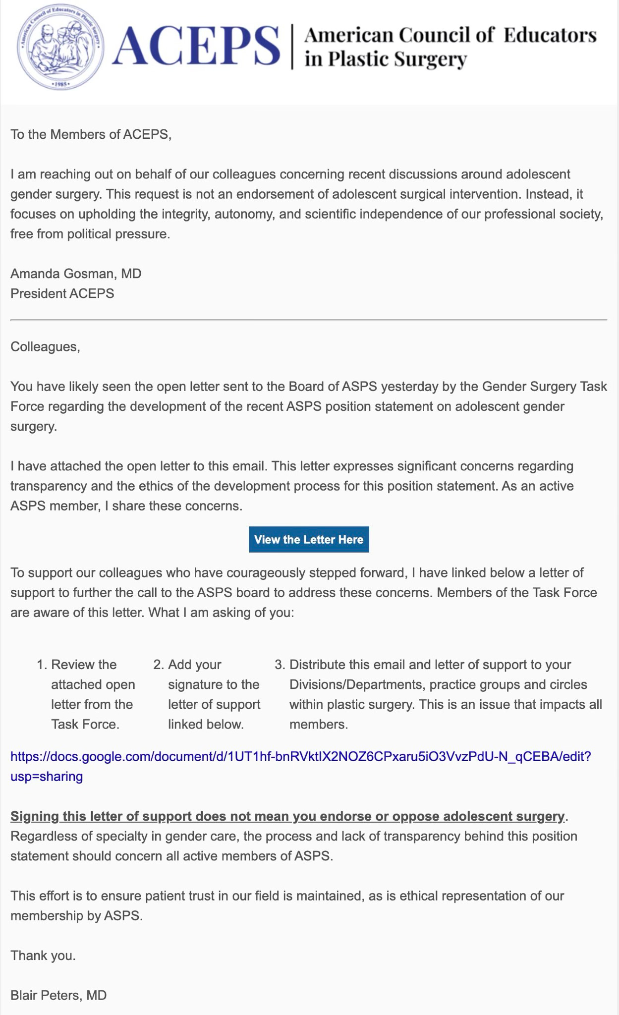 Stepping up his game, Dr. Peters has circulated a sign-on letter among fellow members of the American Council of Educators in Plastic Surgery. The letter, which I obtained and which has over 200 signatures according to a Google doc, criticizes the ASPS board for a lack of transparency. The letter calls the exclusion of the ASPS gender surgery task force from the development process of the ASPS’s position statement “deeply troubling.”