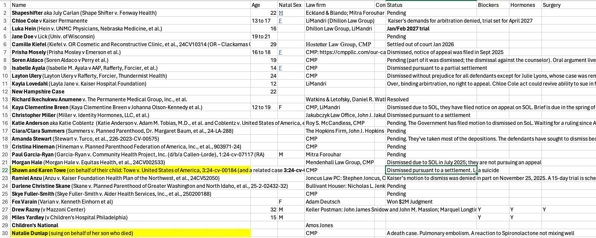 I also just spoke with a knowledgeable source who helped me update my spreadsheet of detransitioner lawsuits. Note that the two that are highlighted in yellow are lawuits waged by family members on behalf of someone who died after receiving gender-transition treatment. So it looks like there are actually only 27 detransitioner lawsuits. The Towe case involves a suicide and the Dunlap case involves a biological male who died of a pulmonary embolism after taking spironolactone.