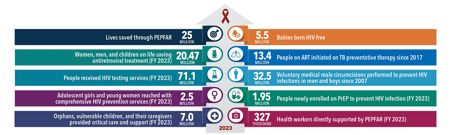 To date, PEPFAR, which operates in 58 countries but focuses the bulk of its efforts in 13 hard-hit sub-Saharan African nations, has channeled more than $100 billion into combatting HIV abroad. Since 2004, it has saved 25 million lives; and it currently provides life sustaining antiretroviral treatment to over 20 million people. Funded at about $6 billion annually since the Obama administration, PEPFAR is widely considered among the greatest foreign-aid public-health success stories in history.