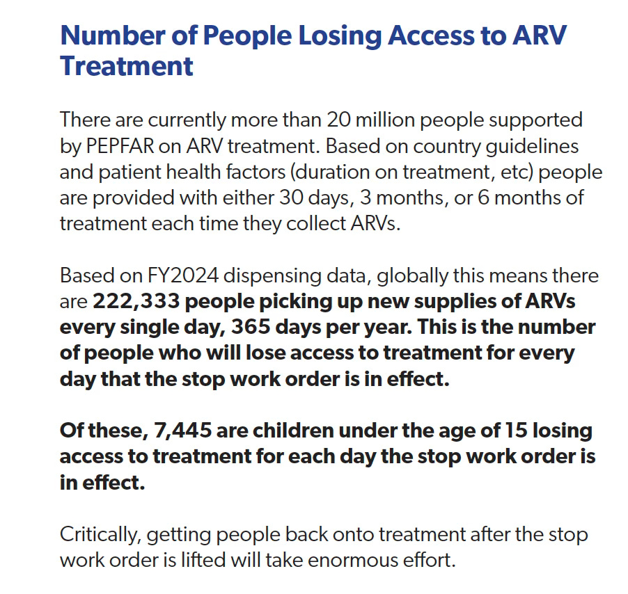 Policy experts at amfAR, the Foundation for AIDS Research estimate that 222,000 people pick up their HIV medications daily from PEPFAR-funded clinics and pharmacies. Within a few weeks of a treatment interruption, HIV rebounds and becomes transmissible—raising the risk of transmission within communities and from mother to child. If the 680,000 HIV-positive pregnant women cared for by PEPFAR cannot remain on antiretrovirals, amfAR estimates that within 90 days, 136,000 of their babies will be born with the lifelong infection.
